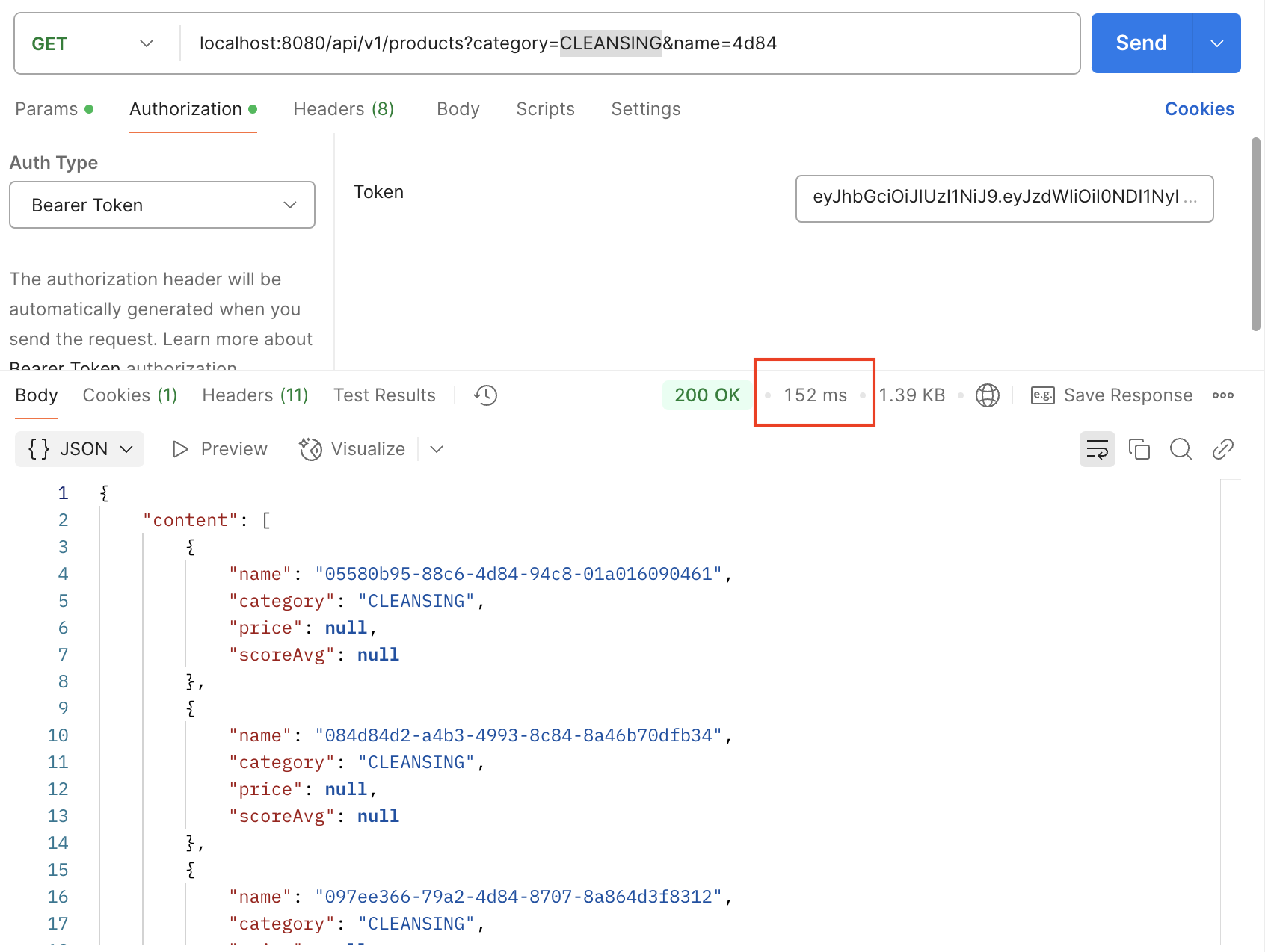 | postman 응답속도 | 580ms | 70ms(8.29배 개선) | 120ms(4.83배 개선) | 152ms(3.81배 개선) |