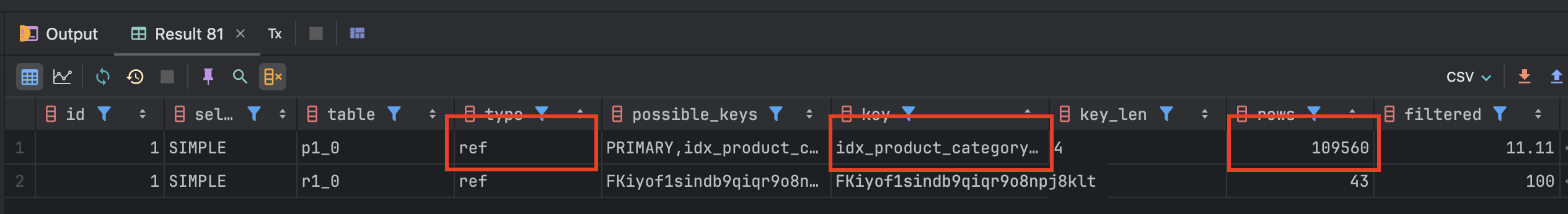 product 테이블에 대한 쿼리를 실행시킬 때는 인덱스를 활용한 스캔(type-ref)을 사용하고, ref 접근 방법이란 조인의 순서와 관계없을 때 + 제약조건이 없을때(유니크 등) + 인덱스의 종류와 관계 없이 사용되는 레코드 조회 방법이다.