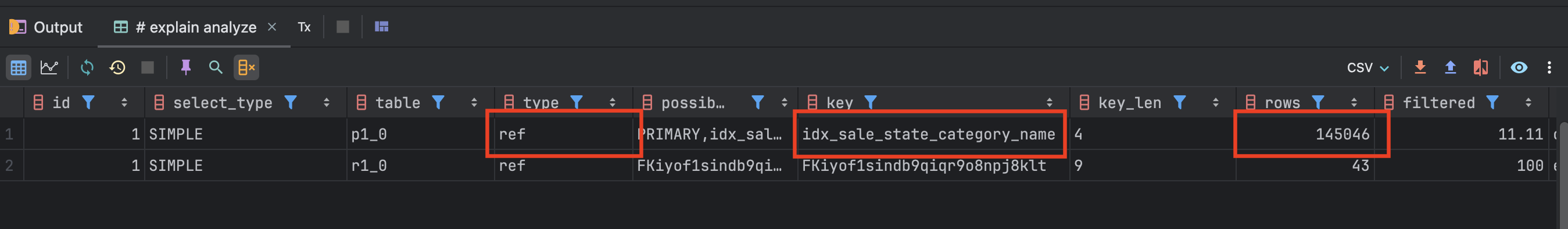 같은 ref 스캔 방식에 키는 idx_category_sale_state, 스캔한 레코드의 수는 109560개라는 것을 확인할 수 있다.(레코드 수 9.31 효율)