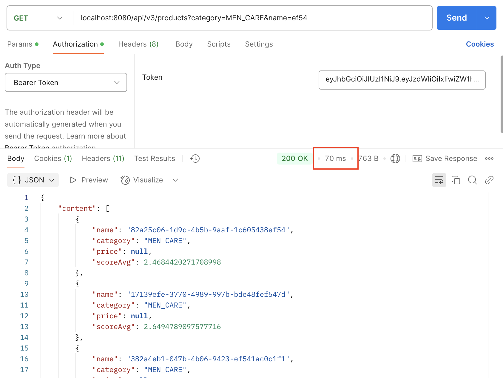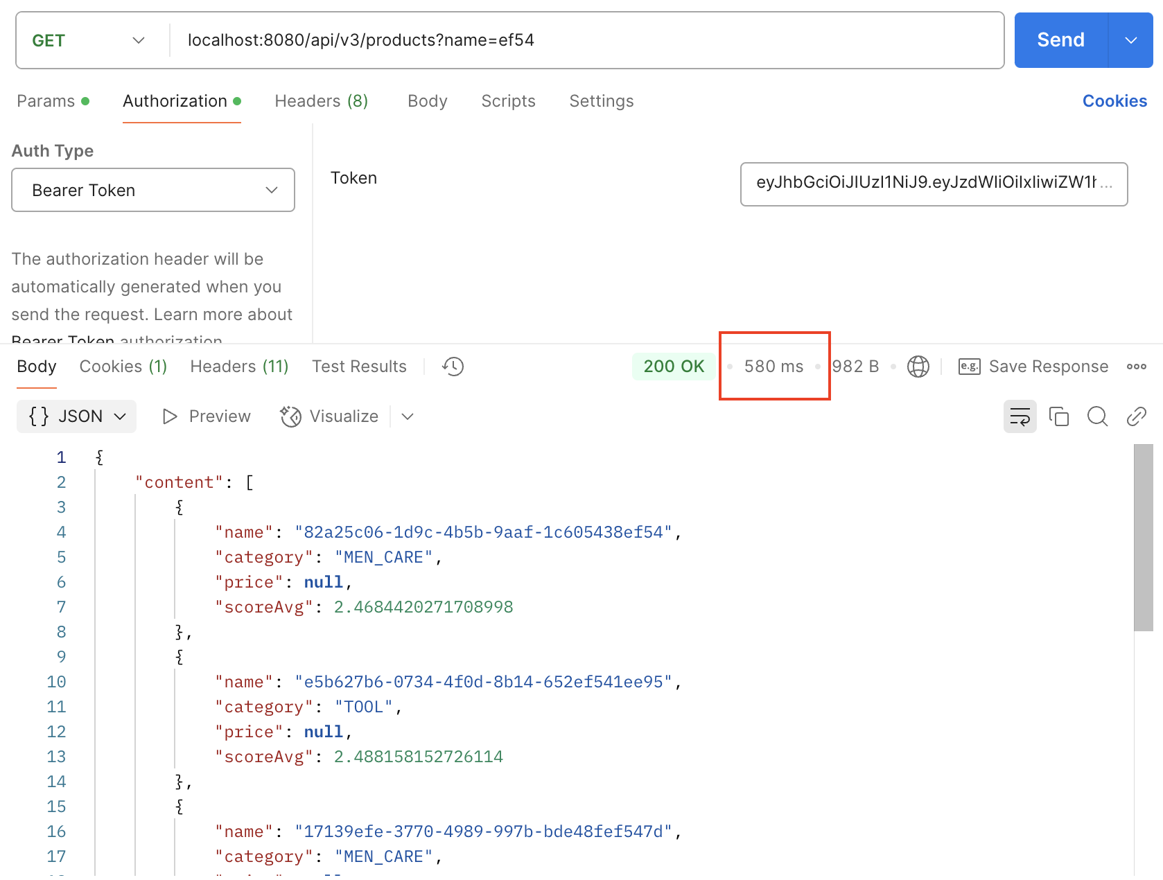 postman으로 검색 결과를 확인하면 다음과 같다.(580ms)