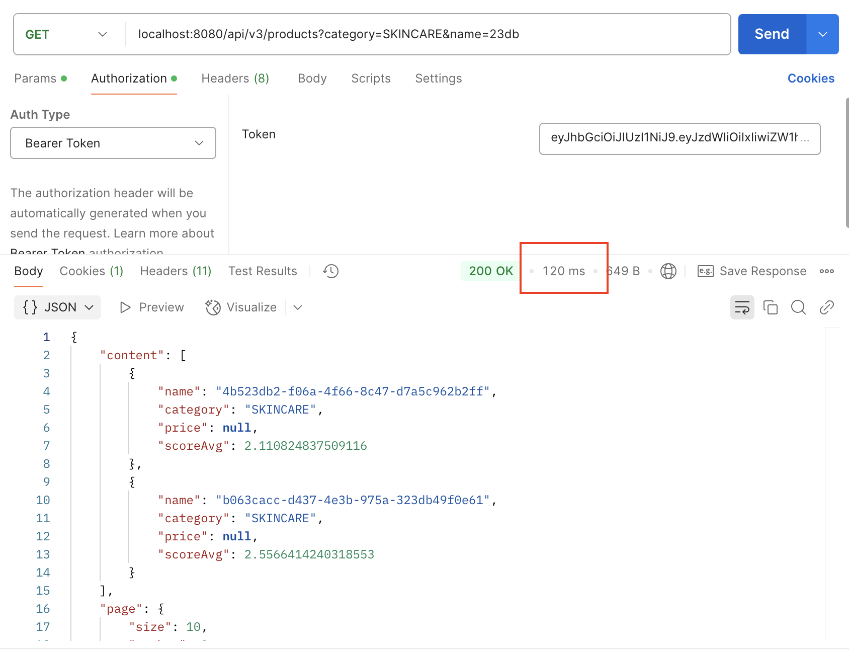 인덱스를 재설정하고 postman응답 속도를 확인해보자. (120ms)