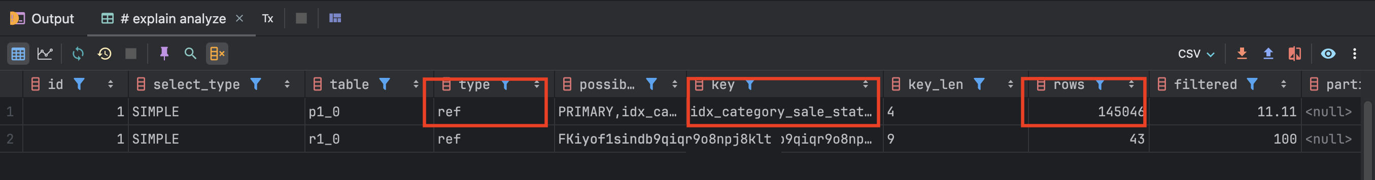 -> Index lookup on p1_0 using idx_category_sale_state (category = 'CLEANSING', sale_state = 'FOR_SALE'), with index condition: ((p1_0.sale_state = 'FOR_SALE') and (p1_0.category = 'CLEANSING')) (cost=10820 rows=114176) (actual time=0.31..105 rows=54853 loops=1)